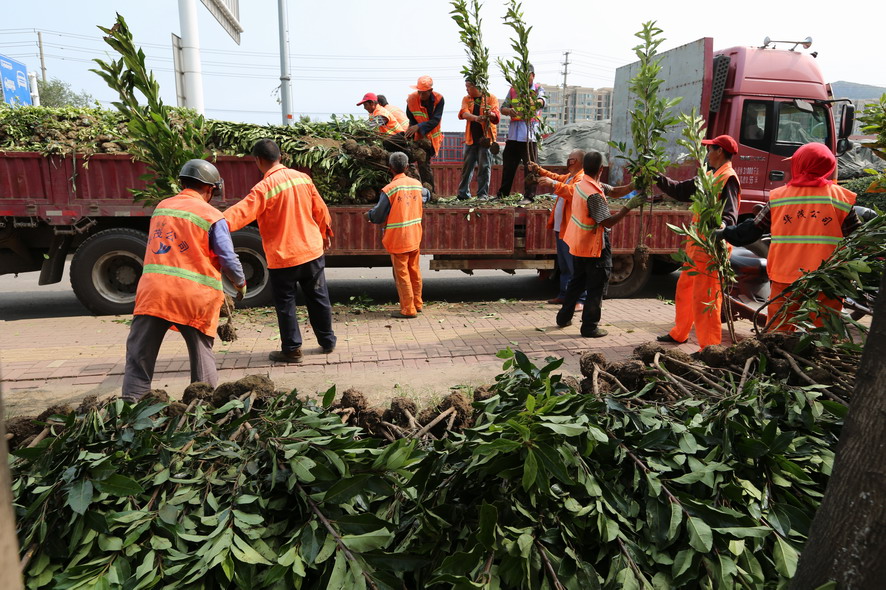 新光路鐵路橋至港城大道段南側綠化帶,因為人為踩踏、車輛碾壓導致綠化斑禿損壞嚴重,為盡快恢復綠化原貌,改善市容市貌。818日,裕升、裕欣養護公司組織80多名綠化工,從早上6點一直干到下午6點,卸苗、運苗、挖坑、插苗,烈日酷暑下奮戰一整天,中午在樹陰下吃點盒飯,喝點礦泉水,繼續工作,橘黃色工作被汗水浸透、被烈日烤干,這樣有好幾個來回。“今天我們要在這片綠化補植紅葉石楠、金森女貞等模紋小苗1萬余株,紅葉石楠球等灌木110株,有效改善該路段綠化植被,提升城市形象,我們還要在黃海續道補植草坪近30000平方,在這條1000多米長的路段,有車輛維修點50多家,車輛出入,對路邊綠化帶傷害非常大,這一路段也是環衛整治長期存在的‘老大難’,這次,在開發區行政執法部門的配合下,我們要重新種植草坪,對這一‘老大難’路段植被進行恢復,另外德蘭南路、東路補植苗木近80萬元的綠化工程也已開工上土整土,接著要栽苗,根據開發區創衛部署要求,上述這些事情必須在8月底完成,所以說時間相當緊,職工們都冒著高溫,加班加點搶進度。”公司副總經理郁宏峰說。