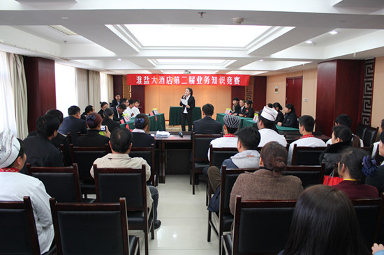 為了進一步提高酒店全體員工安全生產(chǎn)意識以及酒店專業(yè)業(yè)務(wù)水平,淮鹽大酒店于11月19日舉行第二屆“酒店綜合知識競賽”,酒店總經(jīng)理伏運余、副總經(jīng)理楊帆、質(zhì)檢經(jīng)理周洪近、餐飲經(jīng)理郭天麗擔任裁判,現(xiàn)場氣氛非常活躍,競賽取得圓滿成功。