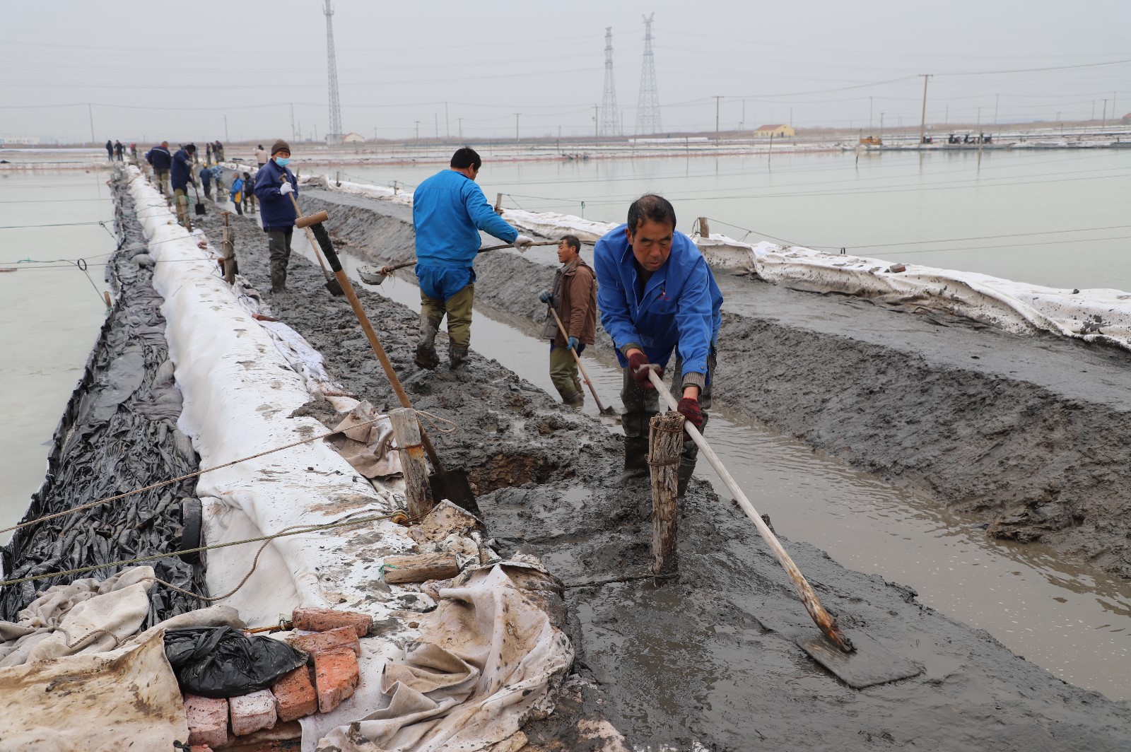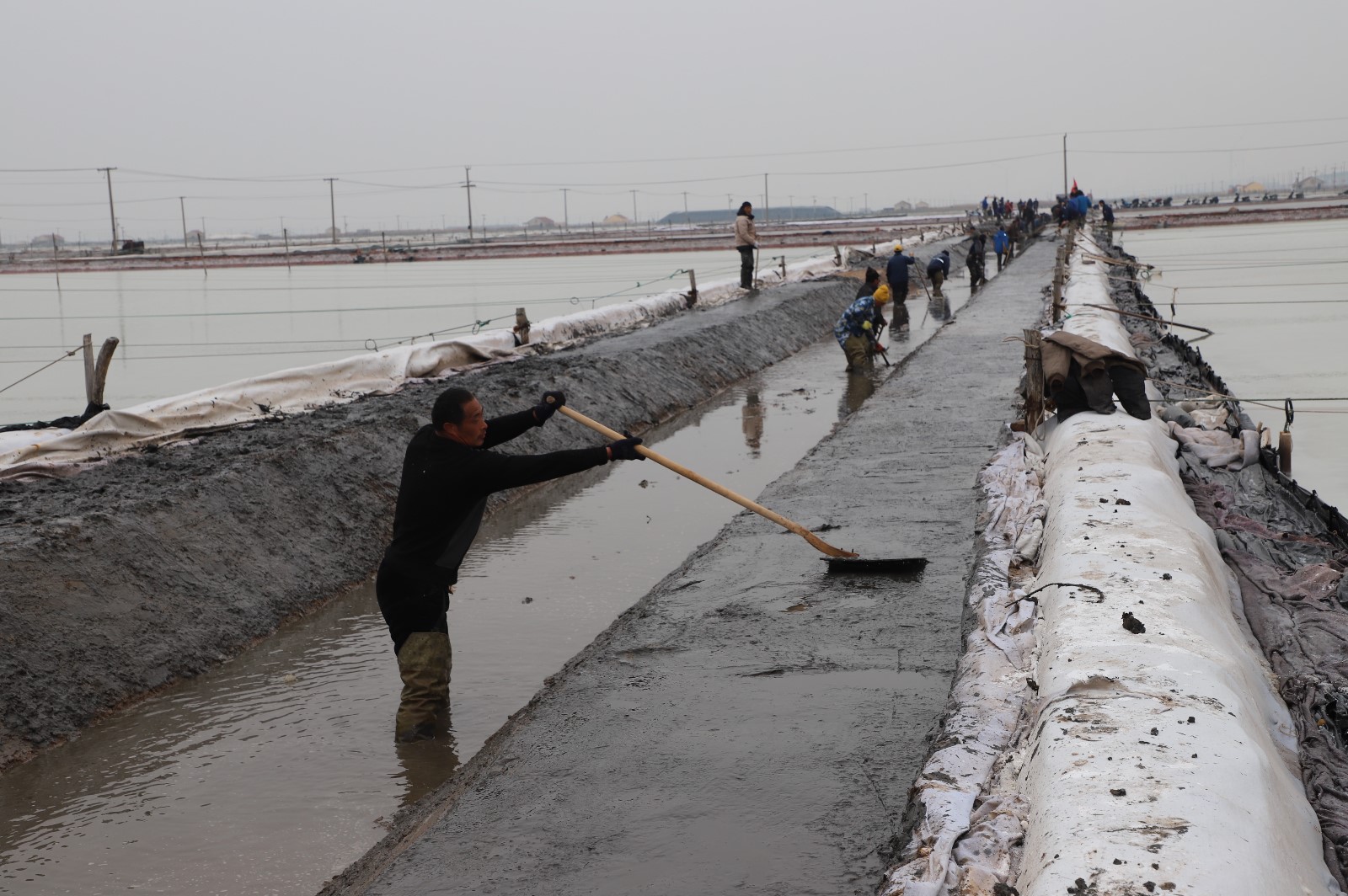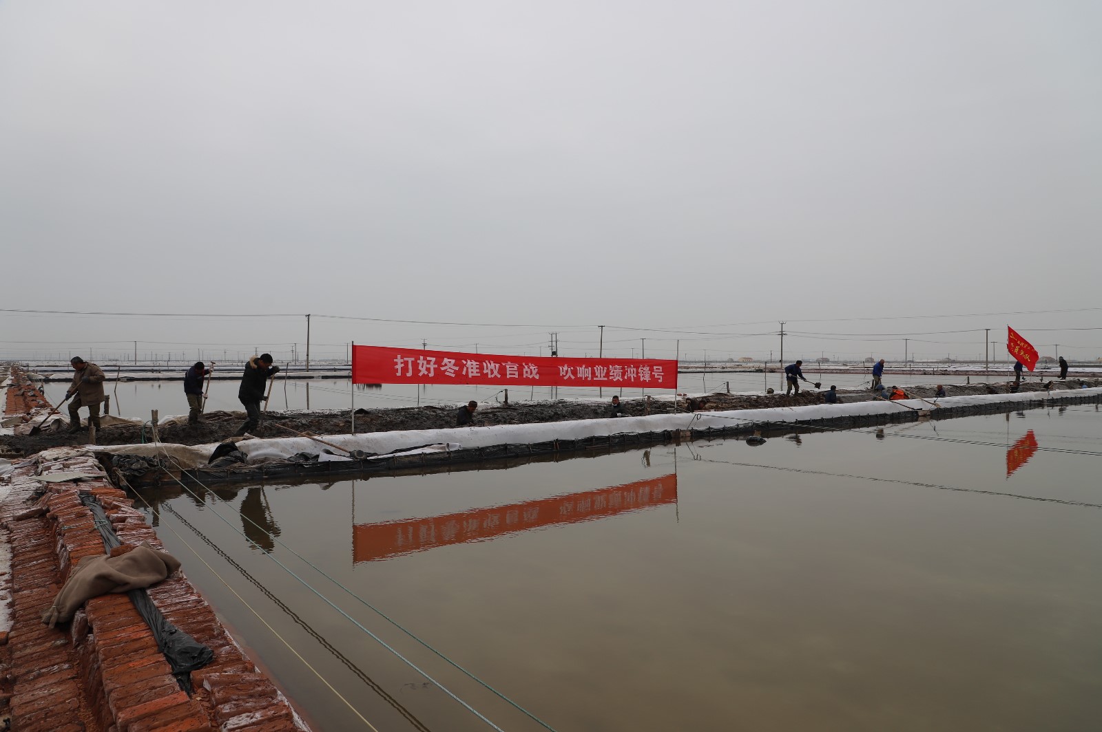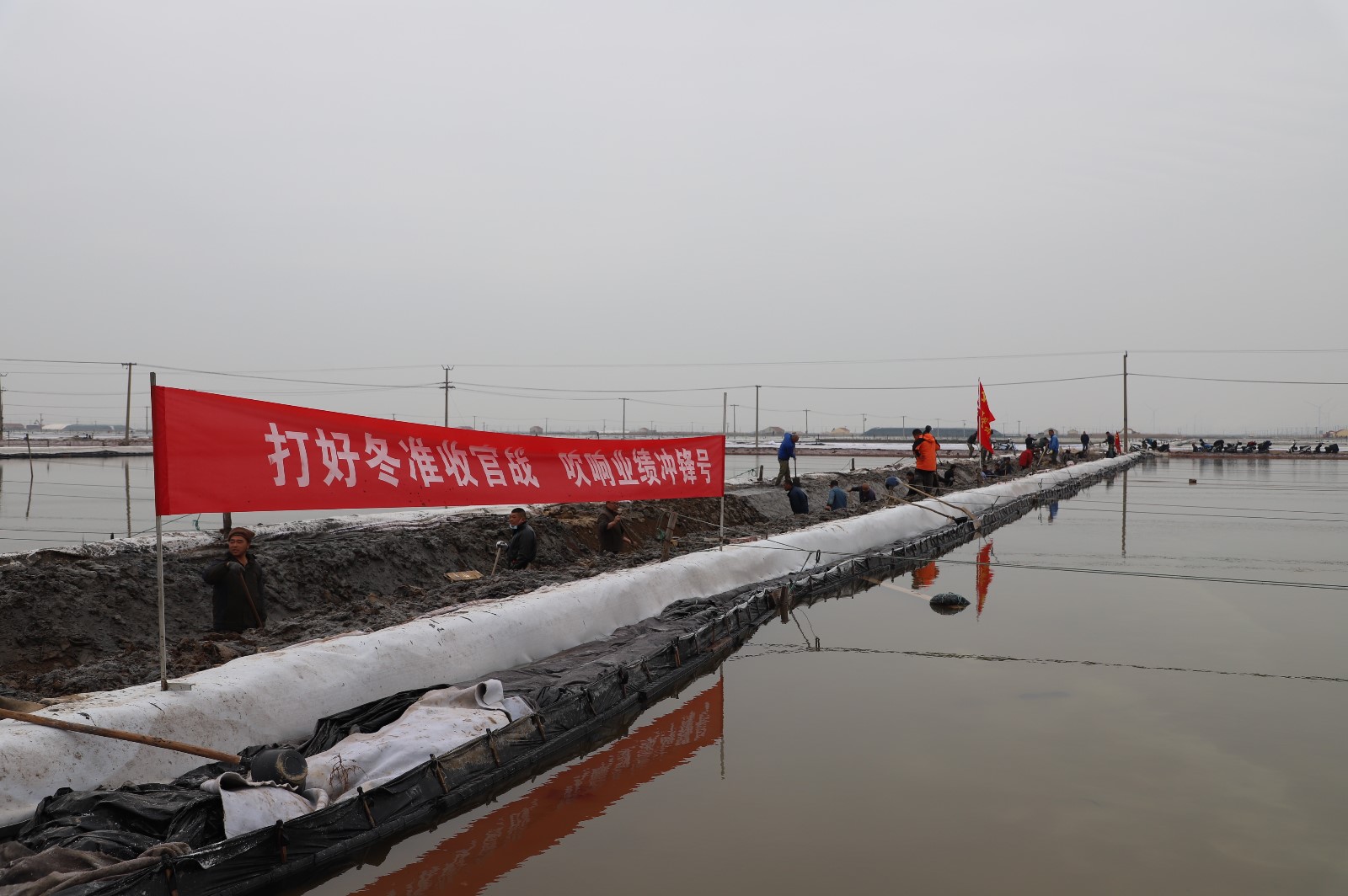 在新河制鹽分公司鹽田地頭的冬準會戰現場,人頭攢動,工人們正動作嫻熟的進行澆水、翻泥、踩實、做埝、整平……,鹽工們全力爭先進位,手腳不停揮鍬挖泥呈現出你追我趕、比肩發力的勞動場景一條條溝道改造、格堰修整等亮化灘場文明建設煥然一新,一幅“人勤春早”的美麗畫卷徐徐展開。