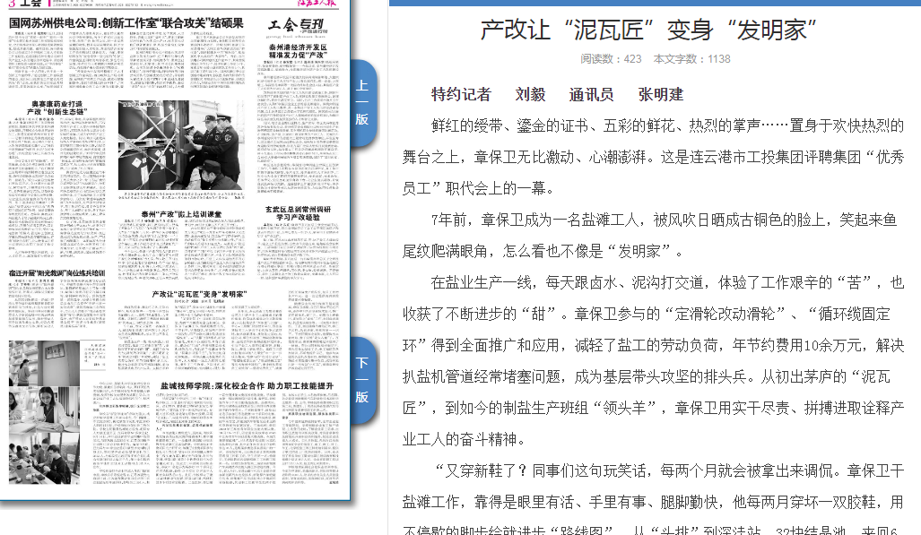 近年來,連云港市工投集團灌西公司為打通產(chǎn)業(yè)工人成長成才的身份壁壘、價值體現(xiàn)壁壘及學(xué)習(xí)教育壁壘,開辦技能培訓(xùn)“大課堂”,打造“一中心+三基地”職業(yè)教育平臺,即金藍領(lǐng)技術(shù)工人培訓(xùn)中心和技能比武基地、技術(shù)創(chuàng)新基地、技能鑒定基地,構(gòu)建公司、單位和班組三級職業(yè)教育體系、技能培訓(xùn)體系和技能評定體系,引導(dǎo)產(chǎn)業(yè)工人重在技能深耕、求精、拔尖、攀高上磨練塑造。章保衛(wèi)正是在技能培訓(xùn)的“大課堂”中一步一步成長起來,他參與的“定時打鹵泵”、“管道輸送加壓法”、“低溫除硫工藝”等技術(shù)得到快速推廣,也讓他從普通員工成長為“二星級優(yōu)秀員工”,被推選擔(dān)任制鹽生產(chǎn)班組長,每月工資增長800元。這一切讓他獲得滿滿的榮譽感和幸福感。