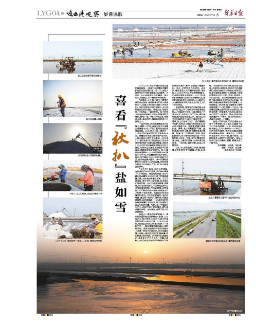 扒鹽現場,指揮生產的程龍是土生土長的“鹽三代”,爸爸和爺爺都是老鹽場人。“和鹽場打交道,心里才踏實。”大學畢業后,在外地工作了幾年,程龍最終還是決定回到鹽場工作。程龍說,純手工扒鹽的年代,鹽工們都很辛苦——春季,鹽工們迎來“大忙”。他們需要防“地漏”,用石拱、壓割機把池底壓實,防止鹵水滲透下去。緊接著,就要忙春季扒鹽。夏季,鹽工們需要防“天漏”,提前將鹵水放進土塘,避免降雨將鹵水稀釋。秋季,鹽工們開始手工扒鹽,用扁擔挑鹵水,用小推車把曬好的鹽一車車推到船上運走。冬季,鹽工們需要對溝道、池埝、土塘進行修復,為來年春天做準備。一年四季,循環往復,鹽場人辛勤勞作。