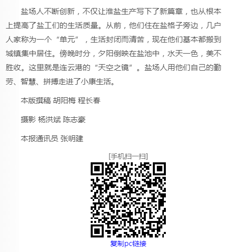 鹽場人不斷創新,不僅讓淮鹽生產寫下了新篇章,也從根本上提高了鹽工們的生活質量。從前,他們住在鹽格子旁邊,幾戶人家稱為一個“單元”,生活封閉而清苦,現在他們基本都搬到城鎮集中居住。傍晚時分,夕陽倒映在鹽池中,水天一色,美不勝收。這里就是連云港的“天空之鏡”。鹽場人用他們自己的勤勞、智慧、拼搏走進了小康生活。