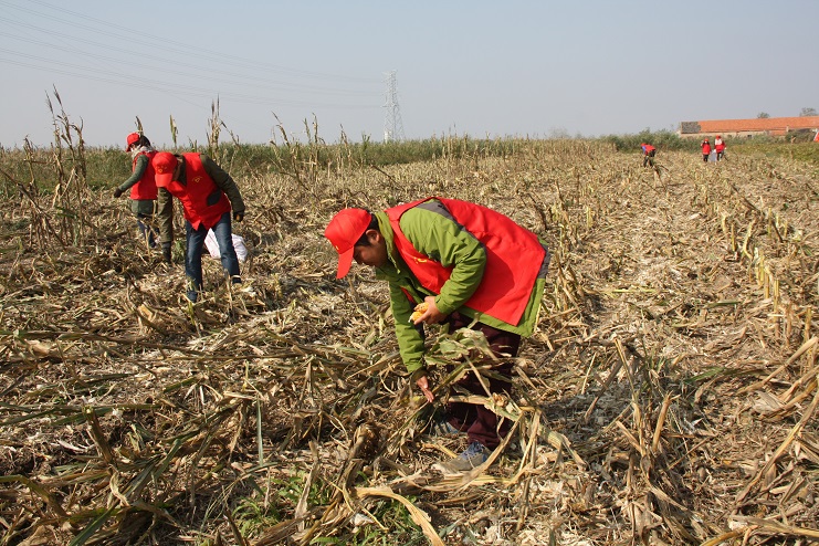 目前,位于柴門居民點附近的灌西實業公司農田已進入作物收獲期,由于所種玉米已經完全成熟,且經歷了一次大風降溫天氣,所以在機械進場作業前,有部分玉米已經掉落在了地上,如不及時撿拾,將造成極大浪費。公司團委在得知這一消息后,立即組織近十名青年志愿者利用中午休息時間,到該公司農田開展撿拾散落玉米志愿服務活動。活動中,大家手拿編織袋,排成橫排仔細搜尋并緩慢向前推進。由于玉米皮與秸稈顏色相近且混雜在一起很難分辨,因此大家在撿拾過程中不僅需要認真搜尋,有時還需要彎腰翻動秸稈,以最大限度的不遺漏任何一個散落的玉米。
