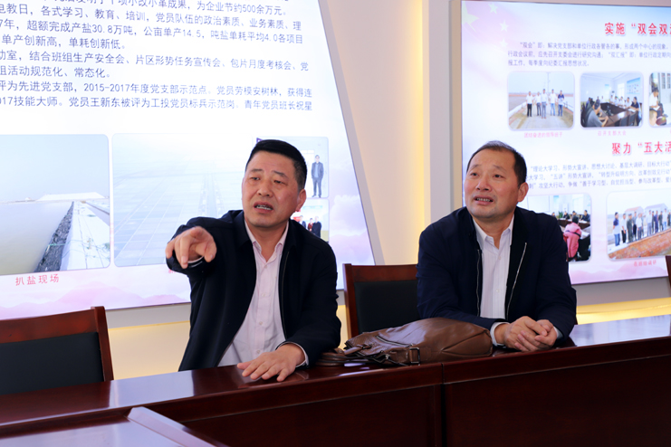 檢查組一行先后到新河制鹽分公司、老機(jī)關(guān)新建黨建室進(jìn)行實(shí)地檢查驗(yàn)收,在新河制鹽分公司黨建活動室,江舜軍部長一行詳細(xì)聽取了該黨支部書記李加新對黨建工作的匯報,隨后,在老機(jī)關(guān)綜合黨員活動中心,檢查組一行利用活動室電子顯示屏觀看了集團(tuán)司歌視頻。