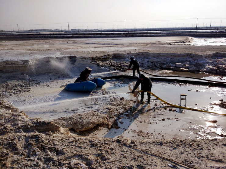 來(lái)到埒南制鹽分公司6班硫酸鈣清理現(xiàn)場(chǎng),只見(jiàn)水槍里射出的水柱把硫酸鈣廢渣沖的四處飛濺,伴隨機(jī)器轟鳴聲硫酸鈣廢液被送出灘外,工友們穿好雨衣,戴好頭盔,手握水槍,一站就是3、4個(gè)小時(shí),他們兩人一組,輪番作業(yè),確保息人不息機(jī)。班長(zhǎng)胡繼華信誓旦旦的說(shuō)我們要發(fā)揚(yáng)一不怕苦,二不怕累的革命精神,發(fā)揚(yáng)“有條件要上,沒(méi)有條件創(chuàng)造條件也要上”的大慶精神,寧愿多加班,少睡覺(jué)也要按期保證完成硫酸鈣清理工作。
