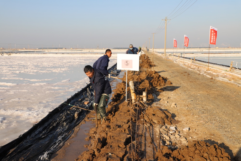 寒冬時(shí)節(jié),暖陽之下,鹽廩之旁,曬得黝黑的鹽場產(chǎn)業(yè)工人們按照競賽的考核標(biāo)準(zhǔn),做熟泥、打堰墻、做堰頂,護(hù)埝頂、夯埝坡、清塘底,見證了一場技能比拼的盛會(huì)。經(jīng)過一天的鏖戰(zhàn),潘成軍師徒取得了池堰修整第一名;董治波師徒取得了土塘清淤第一名。(西工)