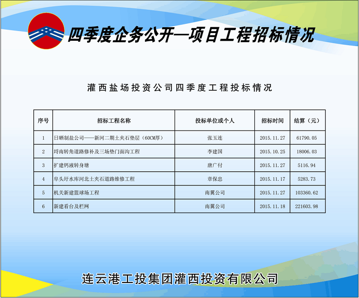 四季度灌西共開工建設(shè)6個工程項目,分4次由投資公司招標(biāo)領(lǐng)導(dǎo)小組采用公開邀標(biāo)形式進行了招標(biāo)。