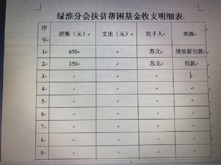 7月27日,綠淮公司出納將1000元現(xiàn)金匯入專有賬戶,標(biāo)志著分會成功引入第一筆扶貧基金。