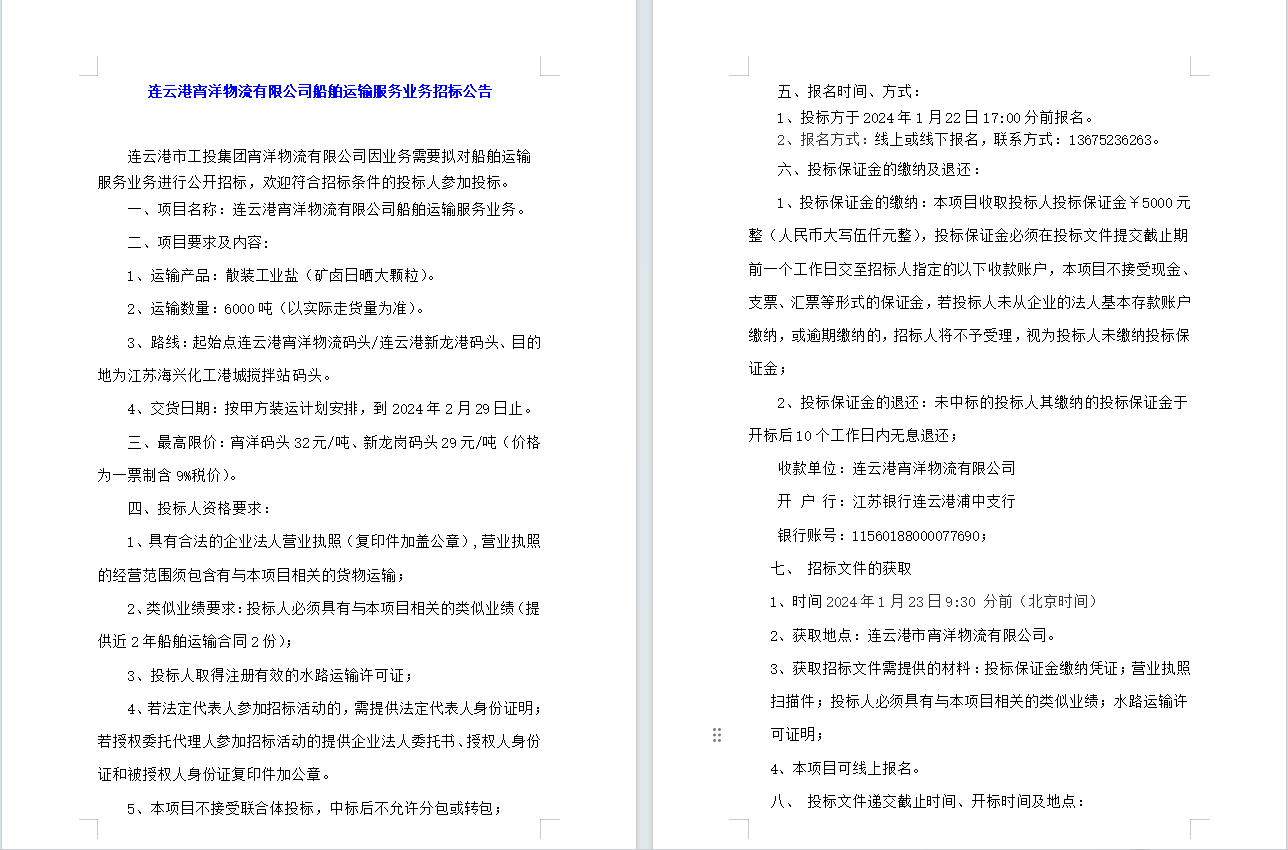 連云港宵洋物流有限公司船舶運輸服務業務招標公告