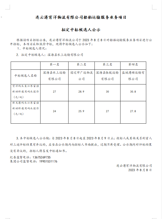 連云港宵洋物流有限公司船舶運輸服務業務項目擬定中標候選人公示