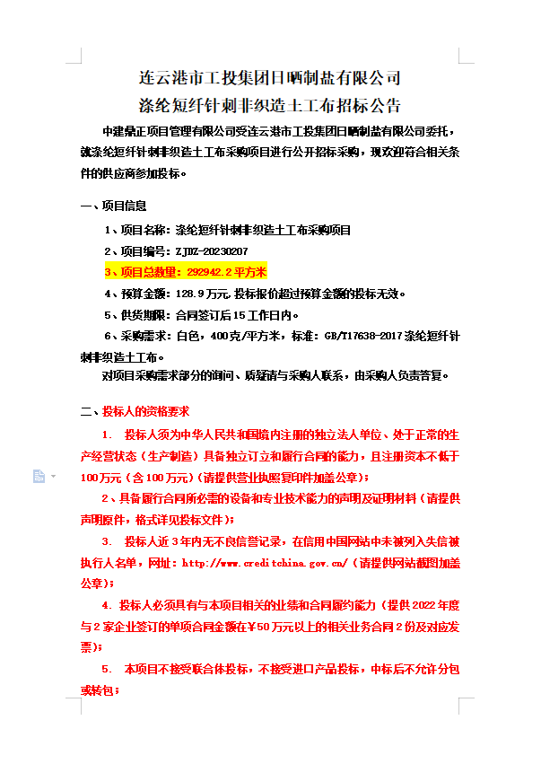 連云港市工投集團(tuán)日曬制鹽有限公司滌綸短纖針刺非織造土工布招標(biāo)公告