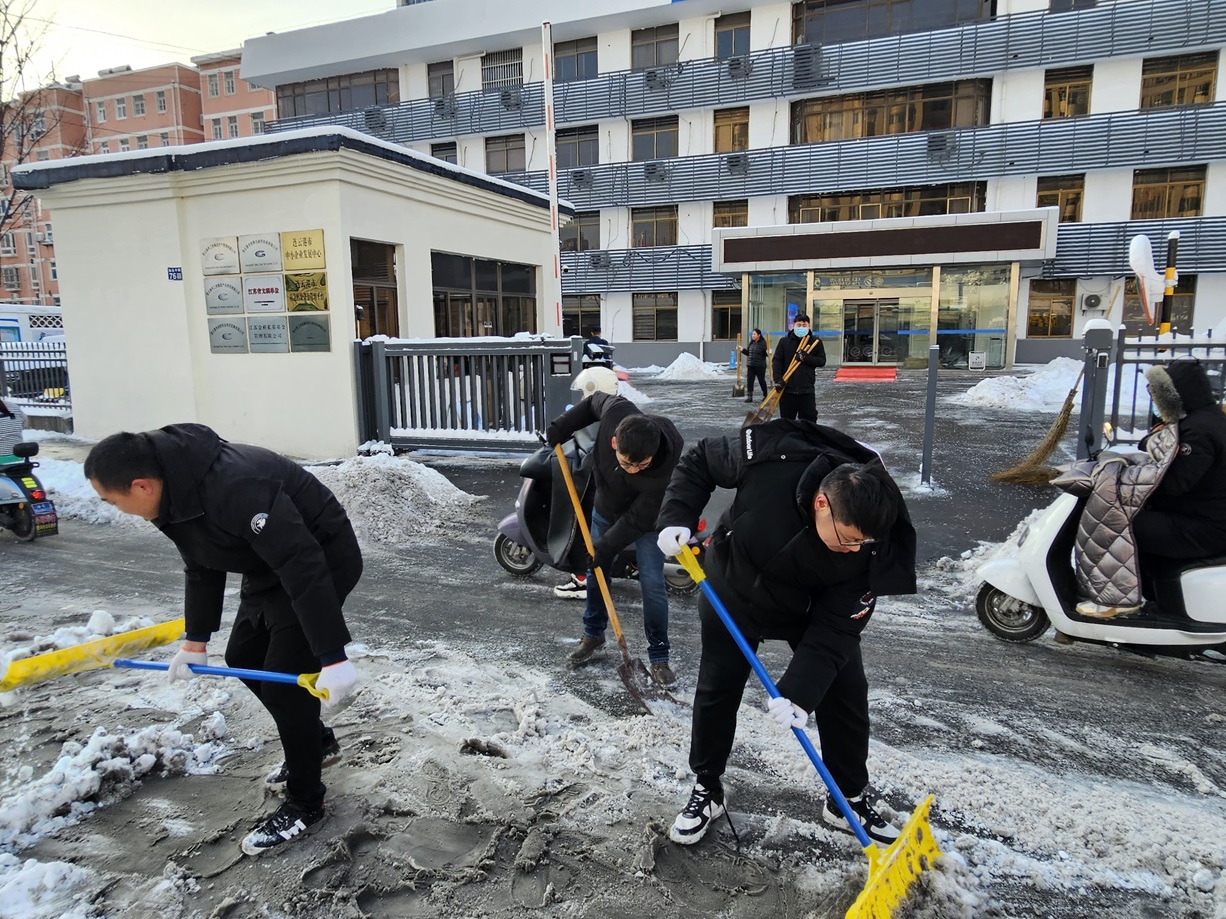 搶干會干巧勁足。“這塊用雪鏟推就行”“那邊不需要掃,直接撒融雪劑”“換這個,更省力”,掃雪現(xiàn)場,大家齊心協(xié)力,組織有序,紛紛施展出自己的“巧勁”。有的員工用鐵鍬鏟雪,有的用掃帚清掃,還有的負責運輸積雪。一時間,院內(nèi)響起“叮叮當當”了鏟雪聲、掃雪聲,匯成了一首團結(jié)協(xié)作、搶干會干的的贊歌。