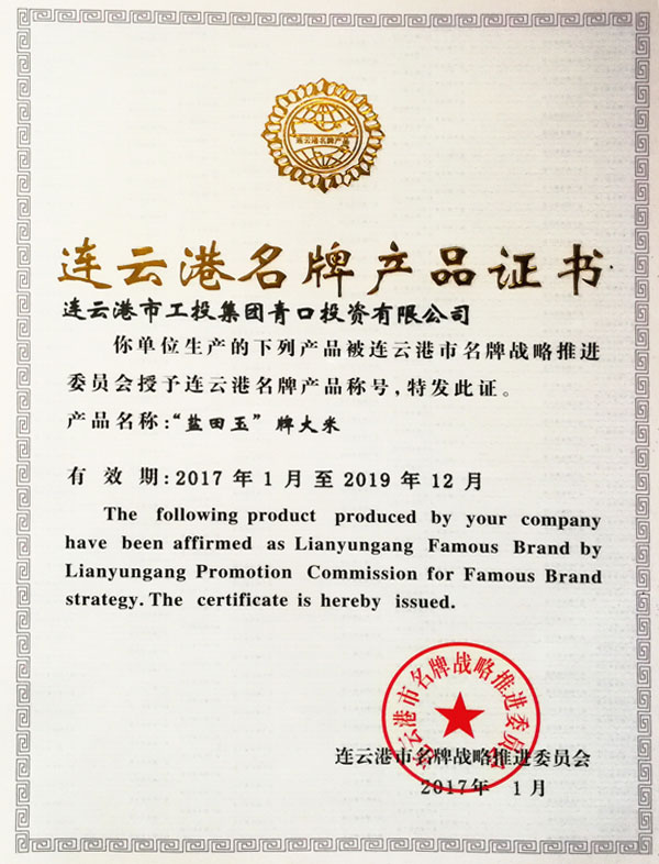 【企業要聞】“鹽田玉”牌大米獲“連云港名牌產品”稱號