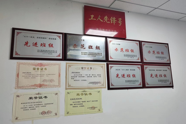 走進質(zhì)檢辦公室,首先映入眼簾的就是這面榮譽墻,上面有近年來集團頒發(fā)的“示范班組”和公司授予的各種榮譽,還有一塊金字招牌,就是市總工會頒發(fā)的“工人先鋒號”。