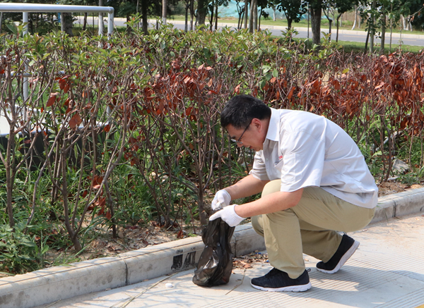 下午的陽光熾熱,女同事們戴著帽子,穿著防嗮服或較厚的秋裝工作服,時不時的在陰涼的地方撿垃圾。李總穿著夏裝工作服一直在陽光下,時而貓著腰,時而抬起膀子抹一下額頭的汗,身旁的同事喊他到陰涼地休息一下,他笑著說:“沒啥,今天的鈣是補足了”,說著又彎下腰干起活來了。